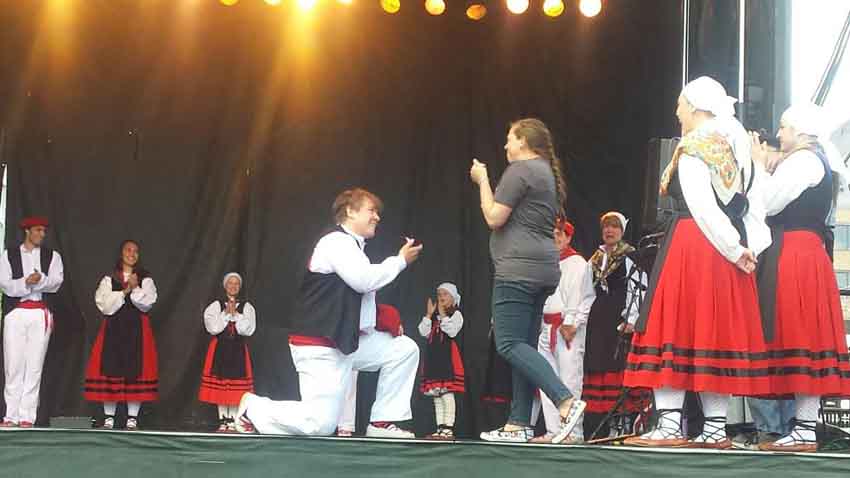 Joseba Etxarri. It was a surprise for almost everybody. Only the musicians and some of the dancers knew about it. Amanda, Cirbie’s girlfriend, was introduced to the Basque culture by Cirbie, and even though she isn’t Basque, she has accompanied Cirbie for the last year and a half, to all of her dance performances. Little did she know, what was waiting for her on May 22 when after one of the dance numbers, some dancers escorted her on stage at the Living Traditions Festival in Salt Lake City. In street dress and surrounded by dancers, she saw that the txistulari and accordionist started to play Aurresku and that Cirbie, nervous, dance in front of her. She didn’t understand why until at the end of the dance, Cirbie got on one knee, and held up a ring asking her to marry her. With one hand over her mouth, she said “oh, my God.” When she said yes, the crowd erupted in applause and many hugs and congratulations followed. The sincere widespread emotion was evident on their illuminated and smiling faces.