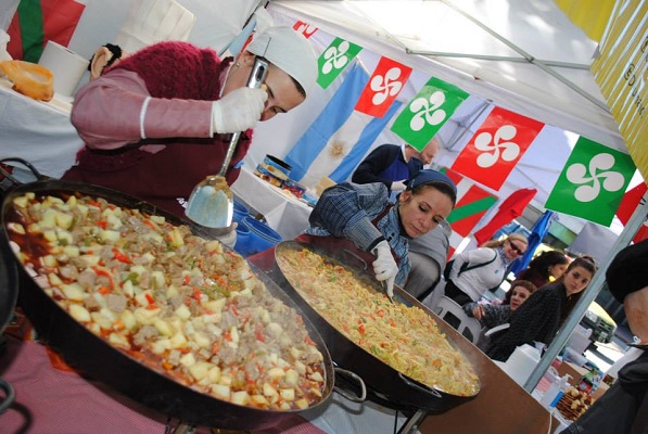 [At the country's capital, for its part the 3rd edition of the “Communities Celebrate the Homeland” took place on the Avenida Caseros. The Laurak Bat Basque club from Buenos Aires was in charge of representing the Basques here and did so with music and food as well as with Buruhandiak and Erraldoiak (photo Colectividades Bs As)]