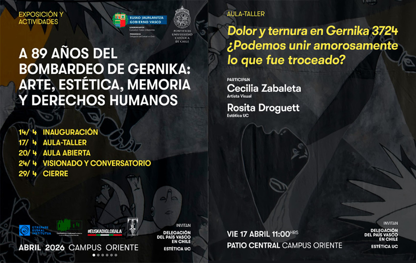 En el marco de la conmemoración de los 89 años del bombardeo de Gernika, el Instituto Interdisciplinario de Estética de la Universidad Católica de Chile, junto a la Delegación del Gobierno Vasco en Chile, les invita a participar de la exposición y ciclo de actividades “A 89 años del Bombardeo de Gernika: arte, estética, memoria y derechos humanos”.