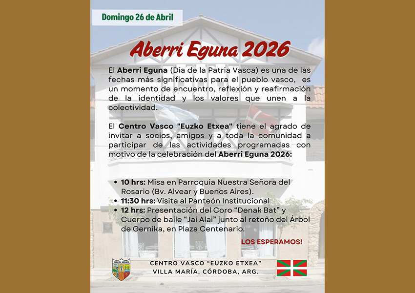Este domingo 26 de abril, el Centro Vasco Euzko Etxea de Villa María festejará Aberri Eguna, la Fiesta de la Patria Vasca.