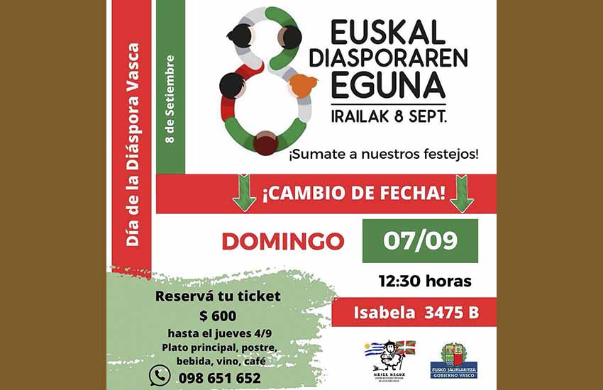El Centro Vasco Haize Hegoa de Montevideo celebrará su almuerzo y encuentro del Día de la Diáspora Vasca este domingo 7 de septiembre a partir de las 12:30 en la sede del Centro.
