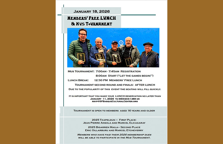 Este domingo 18 de enero a partir de las 7 de la mañana, Campeonato de Mus del Basque Cultural Center clasificatorio para el Nacional de NABO y Almuerzo Anual Gratuito de Socios/as