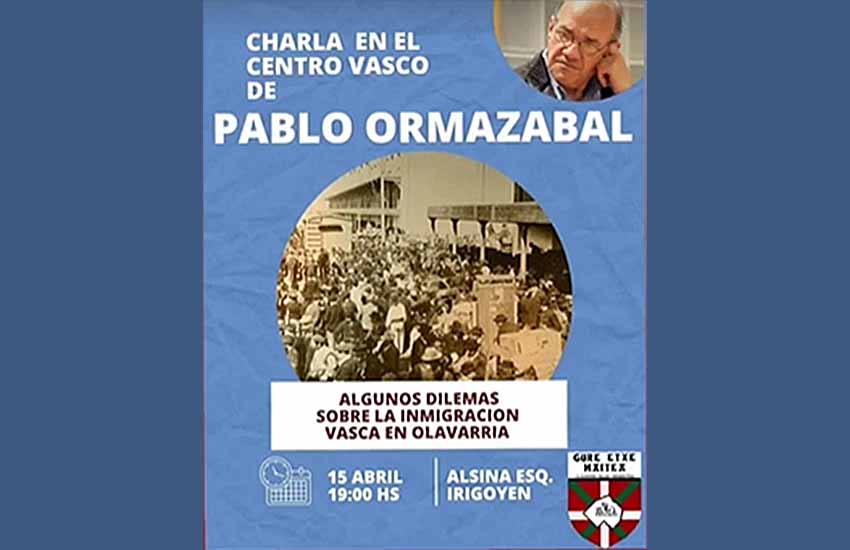 Hoy sábado 15 de abril a las 19:00 horas charla sobre la immigración vasca a Olavarría por Pablo Ormazabal en el Centro Vasco Gure Etxe Maitea.