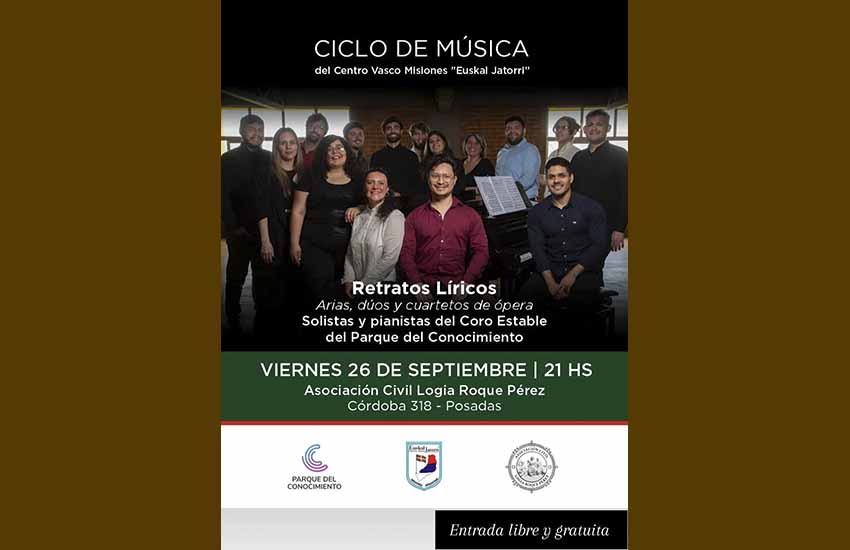 Este viernes 26 de septiembre a las 21:00 hs., nueva sesión del Ciclo de Música del Centro Vasco Euskal Jatorri de Posadas, Retratos Líricos, con solistas y pianistas del Coro Estable del Parque del Conocimiento. Entrada libre y gratuita.