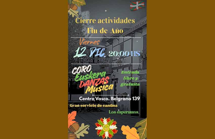 Celebración la noche del viernes 12 de diciembre a partir de las 20 horas del Cierre de Actividades y el Fin de Año en Euzkal Etxea de San Nicolás, con coro y cantos, euskera, dantzak, música... servicio de cantina y un contagioso ambiente de alegría.