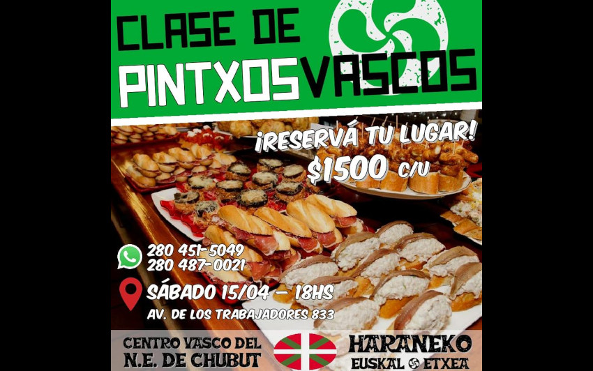 Este sábado 15 de abril, Haraneko Euskal Etxea invita a participar en la clase para aprender a preparar pintxos vascos. A las 18hs, en Av de los Trabajadores 833. Costo $1500. Cupos limitados. Reservas por whatsapp: 280 4515049 / 4870021.