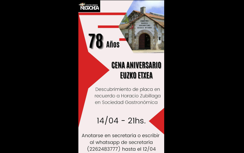 Este viernes 14 de abril, el Centro Vasco Euzko Etxea celebra su aniversario con una cena en la sede. Previamente se descubrirá una placa en recuerdo a Horacio Zubillaga.