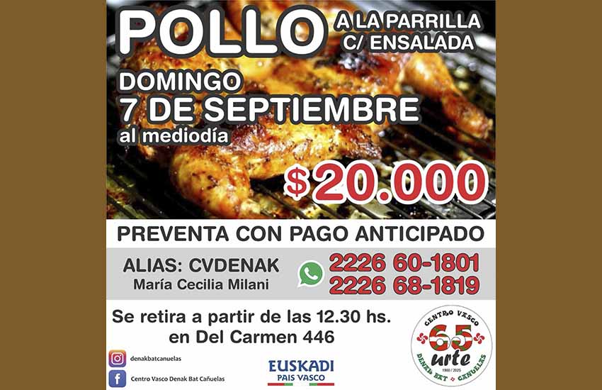 Este domingo 7 de septiembre el Centro Vasco Denak Bat venderá pollo a la parrilla en su sede de Del Carmen.