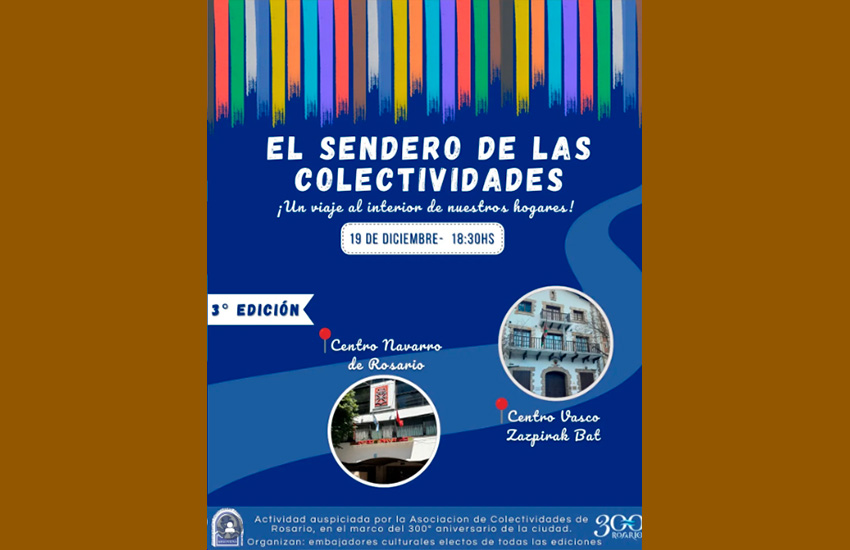 Este viernes 19 de diciembre a las 18:30 h., nueva propuesta de El sendero de las colectividades, en esta ocasión visitando el Centro Navarro (Entre Rios 248) y del Centro Vasco Zazpirak Bat (Entre Rios 261) de Rosario. Duración aproximada, 2 horas.