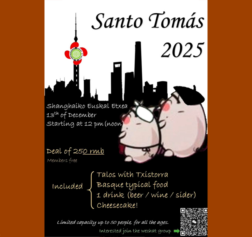 Shangahiko Euskal Etxea celebrará la tradicional fiesta de San Tomás este sábado 13 de diciembre, a partir del mediodía en su sede social, compàrtiendo los tradicionales talo eta txistorra, sagardoa, gazta-tarta y más. Apúntate.