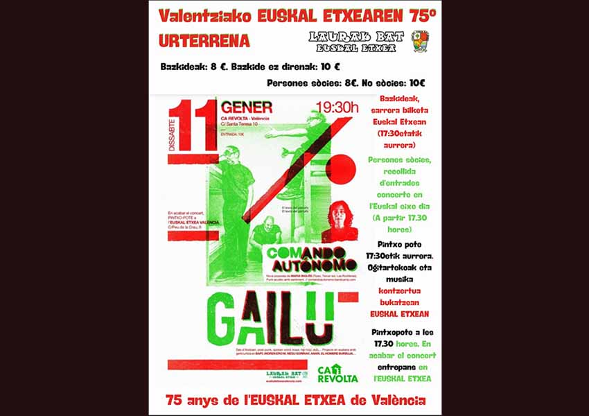 Euskal Etxea de València ha organizado este sábado 11 de enero, en el seno de sus festejo por el 75 aniversario de la entidad, un concierto de Gailu y Comandos Autónomos y un pintxo-pote.