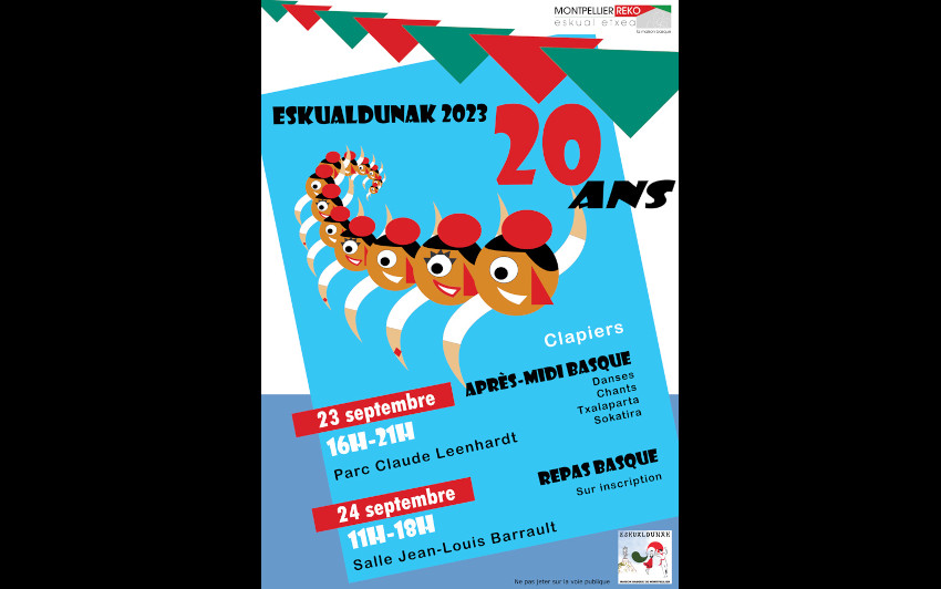 Este sábado la Asociación Eskualdunak de Motpellier y su región festeja su 20 aniversario, de 16 a 20hs en el parque Claude Leenhardt. Habrá canciones con el coro masculino Kantu, bailes y mutxikos con Denak Bat de Toulouse, txalaparta, sokatira, frontón móvil para niños, comida compartida. Actividad gratuita.