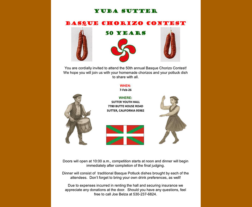 Este sábado 7 de febrero celebrará su 50 aniversario el Campeonato Vasco Anual de Chorizo de Sutter, que organiza la Comunidad Vasca de Yuba City.