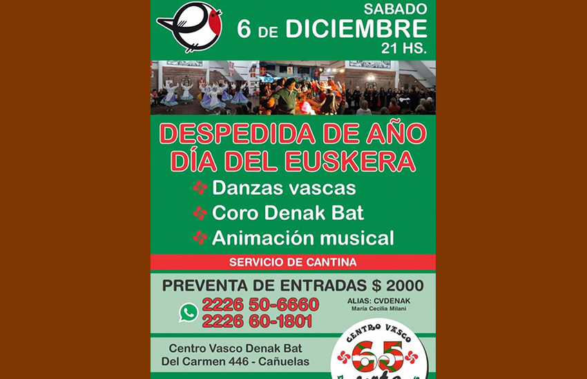 El Centro Vasco Denak Bat de Cañuelas cumplió 65 años en este 2025 y festejará de manera especial la despedida de año, este sábado 6 de diciembre, a las 21 horas, en su sede social, Del Carmen 446. Habrá danzas vascas, animación y se presentará el coro de la institución.