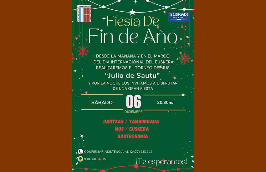Este sábado 6 de diciembre, Fiesta de Fin de Año en el Centro Vasco Lagun Onak de Pergamino, Día del Euskera y Torneo de Mus 'Julio de Sautu'.
