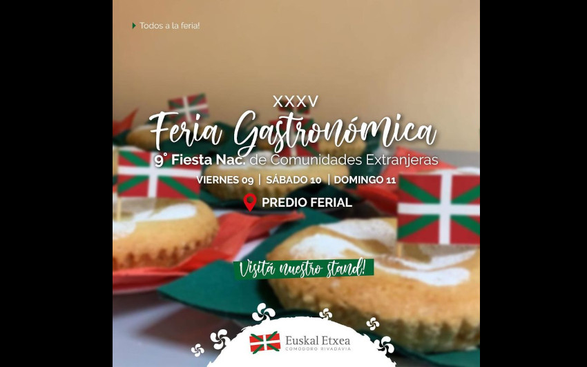 Este viernes 9 de septiembre la Asociación Euskal Echea participará con un stand gastronómico en la Feria de Comunidades Extranjeras. Además, actuarán los cuerpos de baile de la euskal etxea. Desde las 20hs, en el Predio Ferial.