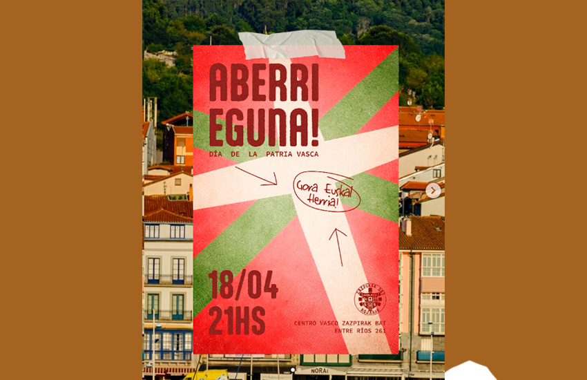 Este sábado 18 de abril, a partir de las 21 horas, cena de celebración de Aberri Eguna en la sede del Centro Vasco Zazpirak Bat de Rosario.