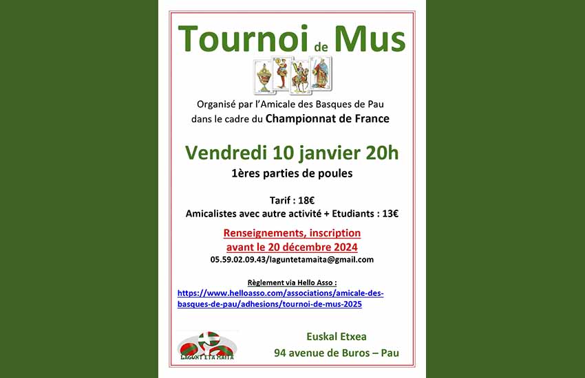 Este viernes 10 de enero a las 20 horas, inicio de la actividad de Mus 2025 en la sede del Centro Vasco Lagunt eta Maita de Pau, con la apertura del Torneo de Mus clasificatorio de cara al Campeonato de Francia, en el seno del Campeonato Mundial de Mus de Colectividades Vascas 2025.