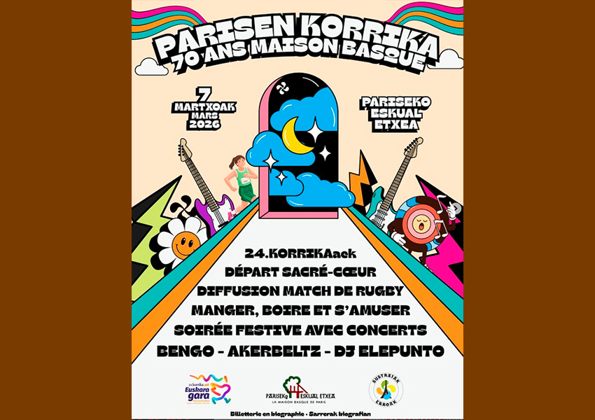 A las 15 horas, quien así lo desee podrá seguir el partido de rugby Escocia-Francia de la Liga de las Naciones. A las 17 horas la Korrika partirá de Sacré Coeur para cruzar la ciudad y llegar a Euskal Etxea de París, donde se llevará a cabo toda una fiesta vasca con comida, conciertos... con los grupos Bengo, Akerbeltz y el DJ Eelepunto.