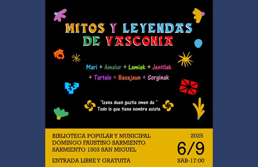 El sábado 6 de septiembre a las 17:00 horas, sesión sobre Mitos y leyendas de Vasconia en la Biblioteca Popular Sarmiento, organizada por la agrupación cultural vasca local Askatasunaren Bidea. Entrada libre y gratuita.