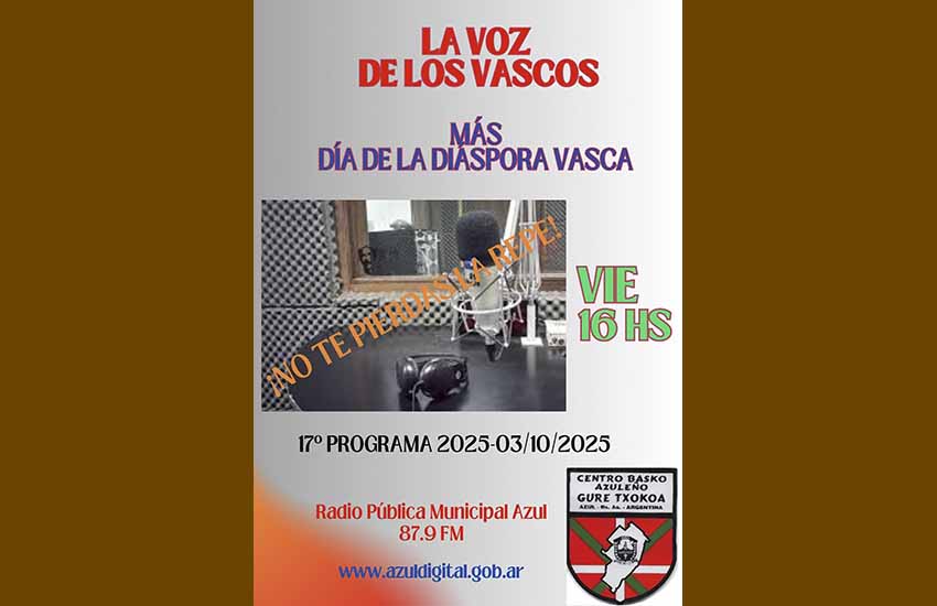 Este viernes 3 de octubre, online y por las ondas nueva emisión del programa radial "La Voz de los Vascos", en este caso repetición del del pasado viernes, dedicado al Día de la Diáspora y más temas, de la mano de María Inés Etchevers Aizpiri. Auspicia Centro Basko Azuleño Gure Txokoa.
