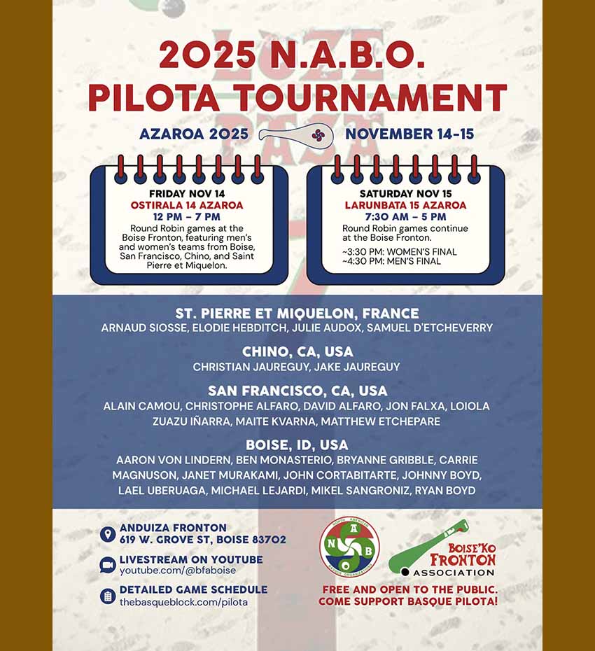 Este viernes y sábado, 14 y 15 de noviembre, partidos de pelota de pelotaris de euskal etxeas de NABO, en el frontón Anduiza de Boise, organiza la Boiseko Fronton Association.