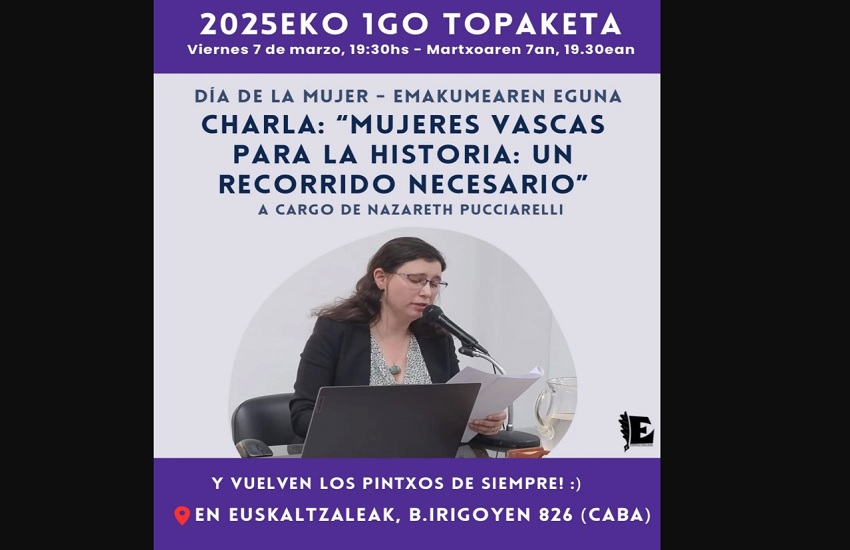 En el primer encuentro del año, Euskaltzaleak de Buenos Aires celebra el Día Internacional de la Mujer con la charla “Mujeres vascas para la Historia: un recorrido necesario”, a cargo de Nazareth Pucciarelli. Este viernes 7 de marzo, a las 19:30 horas, en la sede del euskaltegi porteño. Al finalizar, pintxos.