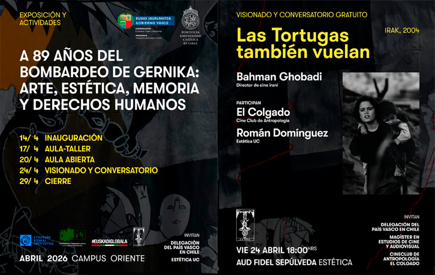 En el marco de la conmemoración de los 89 años del bombardeo de Gernika, el Instituto Interdisciplinario de Estética de la Universidad Católica de Chile, junto a la Delegación del Gobierno Vasco en Chile, les invita a participar de la exposición y ciclo de actividades “A 89 años del Bombardeo de Gernika: arte, estética, memoria y derechos humanos”.