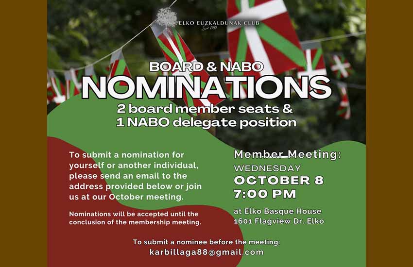 Este miércoles 8 de octubre, reunión en la sede de la entidad de Elko Euzkaldunak Basque Club, entre otros puntos para renovar autoridades.