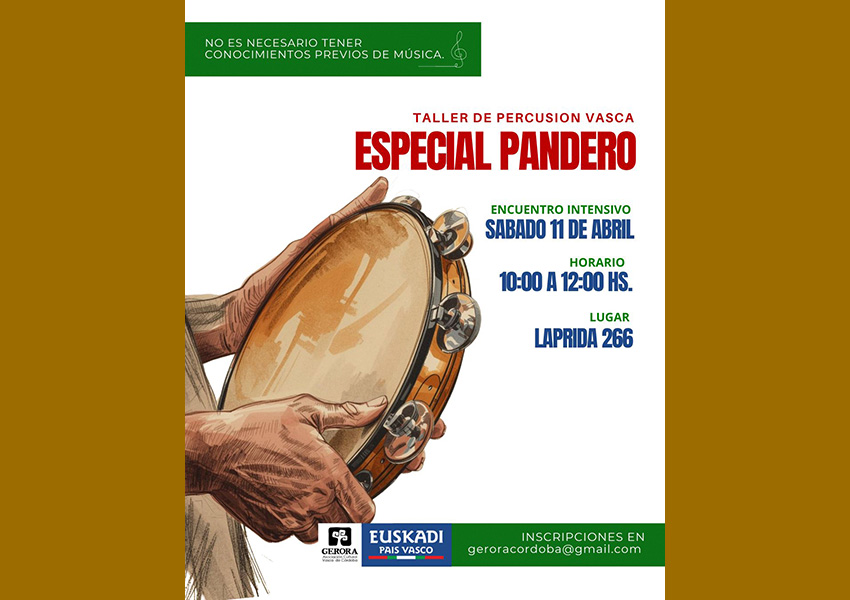 Este sabado 11 de abril en Córdoba, de la mano de la Asociación Cultural Vasca Gerora de Córdoba, Taller de Percusión, pandero, encuentro intensivo, no son precisos conocimientos previos.