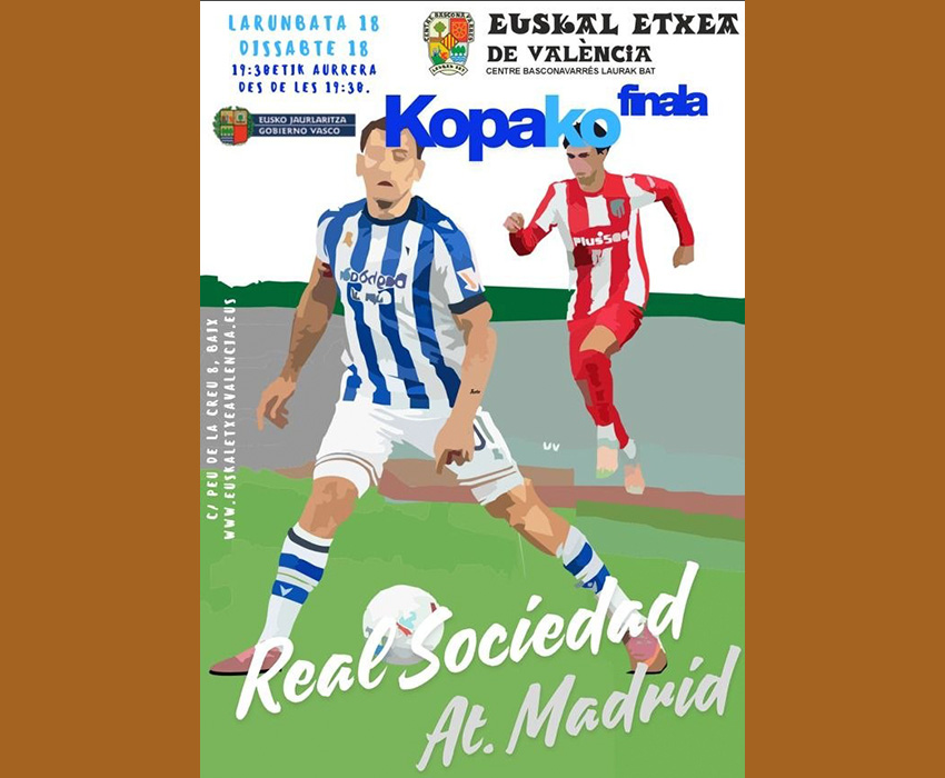 A partir de las 19:30 vente este sábado 18 de abril a Euskal Etxea de València a seguir el partido de Final de la Copa del Rey entre la Real Sociedad de San Sebastián y el Atlético de Madrid.