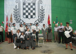 A continuación los asistentes ocuparon las mesas del amplio patio, presidido por un escudo del valle de Baztan de grandes dimensiones. Las mesas decoradas con manteles a cuadros blanco y negro, así como las cuatro banderas, adornaban el evento, dando el imprescindible toque baztanés a la fiesta. [En la imagen del texto vista general del patio del Centro Vasco (foto MEE)]