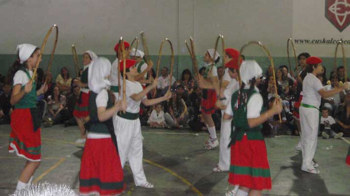 [Alumnos de sexto grado bailando 'Arku dantza' en la Fiesta Vasca (foto EuskalKultura.com)]