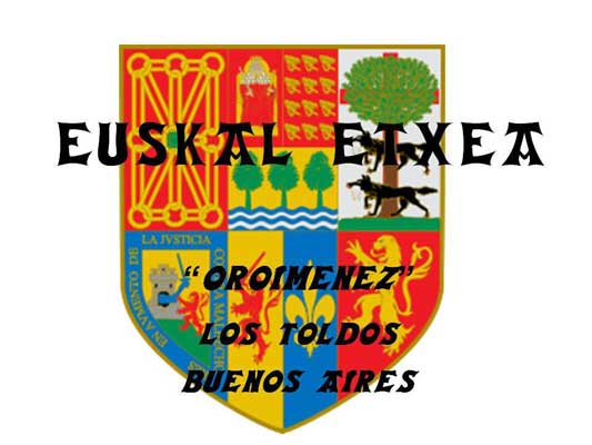 ONGI ETORRI- BIENVENIDOS,A LAS AMIGAS Y LOS AMIGOS DELCENTRO VASCO OROIMENEZ de LOS TOLDOS, provincia de Buenos Aires. ARGENTINA. Estamos plenamente convencidos que seràn fieles en sus actividades el lema que han elegido OROIMENEZ-EN MEMORIA DE AQUELLAS Y AQUELLOS VASCOS y VASCAS QUE LLEGARON UN DIA A LOS TOLDOS, para dar lo mejor de si por esta nuestra querida PATRIA ARGENTINA E INCULCARON EN SUS DESCENDIENTES LOS VALORES ETICO-MORALES QUE DEFINEN AL PUEBLO VASCO. EL AMOR A LA TIERRA, LA CASA, LA FAMILIA, EL APELLIDO. ZORIONAK- FELICIDADES y a SEMBRAR CULTURA VASCA.