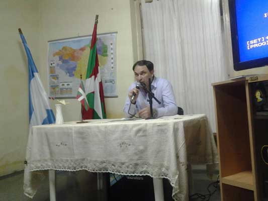 [El director del programa radial paranaense Presencia Vasca, Federico Borrás, en su reciente exposición sobre el Bombardeo de Gernika en la sede de Urrundik (fotoEE)]