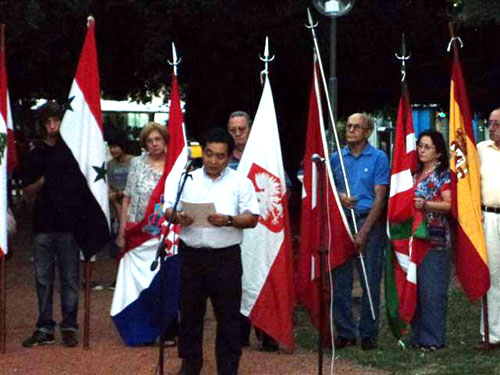 Santa Fe, Argentina. El acto solidario se desarrolló el viernes de la pasada semana en la Plaza España de Santa Fe, frente al Bar Tokyo --"por lo que él representa"-- contando con una nutrida representación de colectividades extranjeras presentes en Santa Fe.