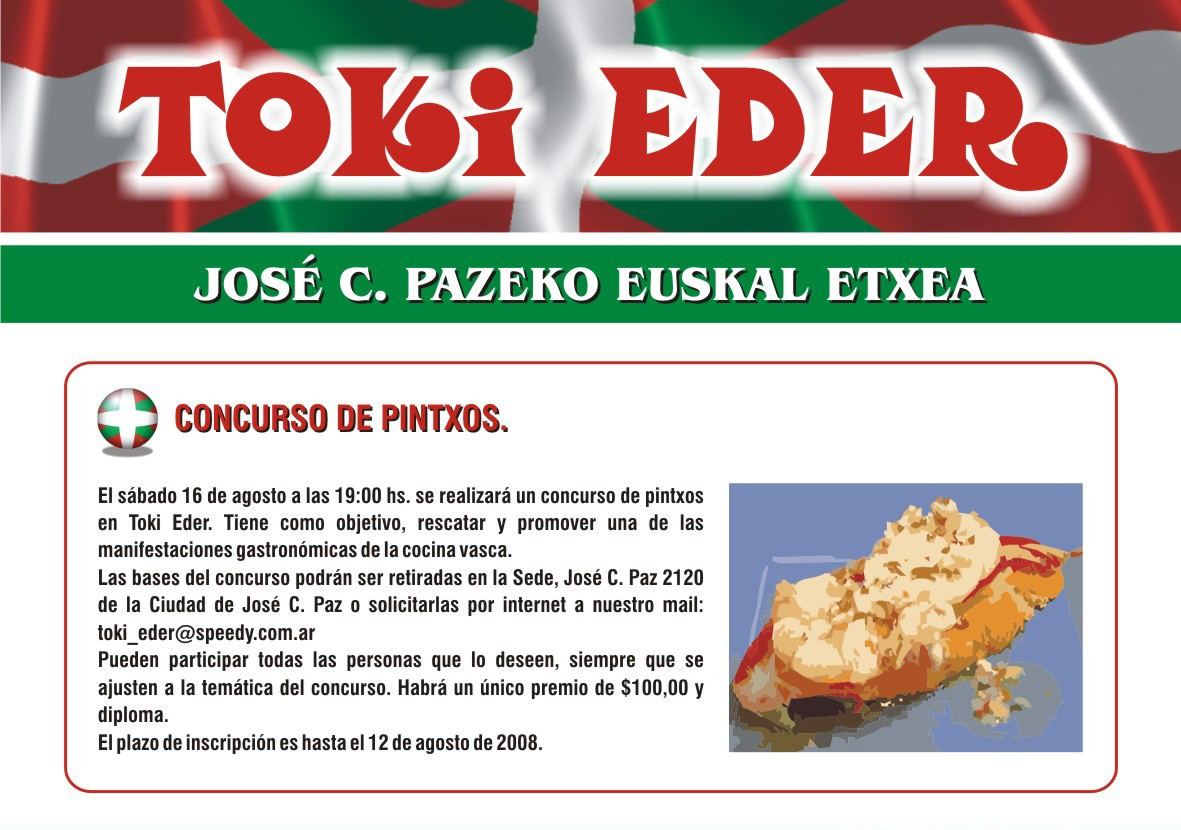 De hecho, Toki Eder se ha marcado el objetivo de impulsar esta costumbre o arte vasco en Argentina, y qué mejor manera que invitar a la gente a probar y elaborar sus propios pintxos en un concurso. La participación es libre y mientras se respeten las reglas quien quiera puede apuntarse. El plazo de inscripción concluye el 12 de agosto. Cada participante podrá presentar como máximo dos tipos de pintxos, y de cada tipo deberá realizar tres para que cada uno de los miembros del jurado pueda catarlo. Los concursantes deberán presentar un sobre con su seudónimo y el nombre con que han bautizado el pintxo, y dentro del sobre, en una hoja tamaño carta, su nombre y apellido y la receta del pintxo.