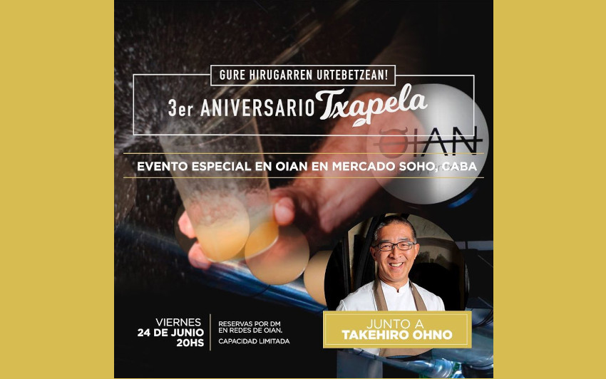 Buenos Aires, Argentina. Txapela Sidra Vasca Natural cumple tres años y lo festejará en junio junto a reconocidos restaurantes de Argentina. Esta semana es el turno de Oian, el restaurante de tapas y pintxos del chef Takehiro Ohno. El restaurante se encuentra en el Mercado Soho de Palermo (Buenos Aires), un lugar con encanto que ofrece comida callejera gourmet de distintos lugares del mundo. La cita con Txapela es el viernes 24, de 20 a 23hs, con menú y descuentos especiales y sidra tirada al txotx libre.