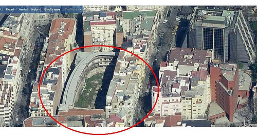 [Imagen aérea en la que se aprecia la privilegiada situación del frontón, junto a la Castellana, y el espacio que ocupa]