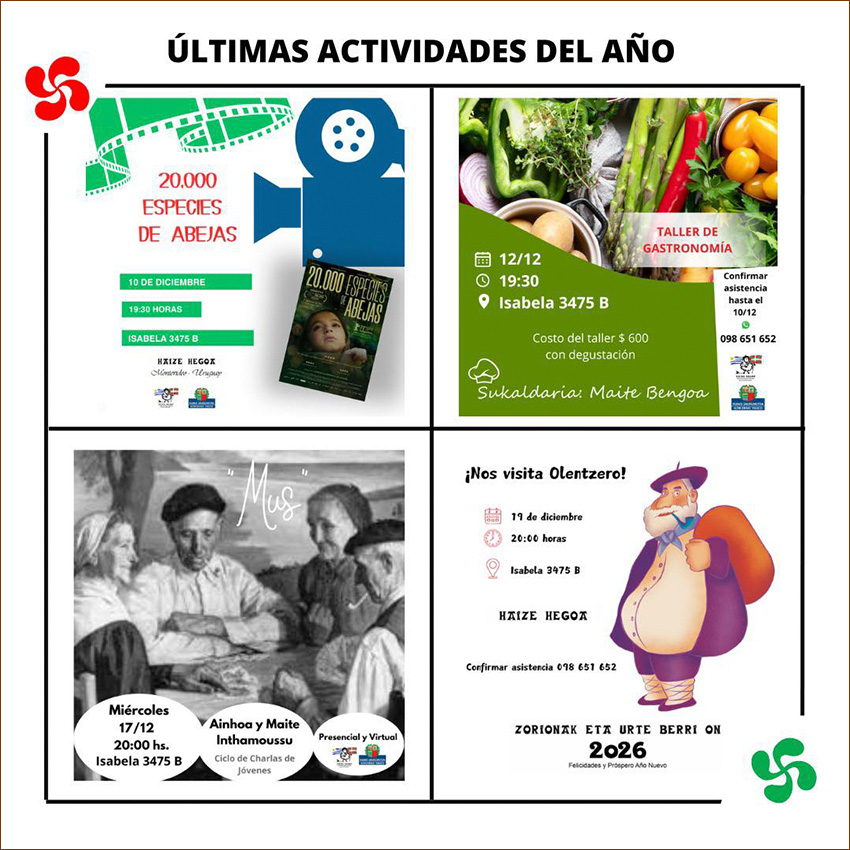 Abenduaren 10ean, asteazkena, Euskal Zinema saioa Haize Hegoa Euskal Etxean, Alaida Ruiz de Azuaren "20.000 especies de abejas" filma emanez 19:30ean elkartearen egoitzan.
