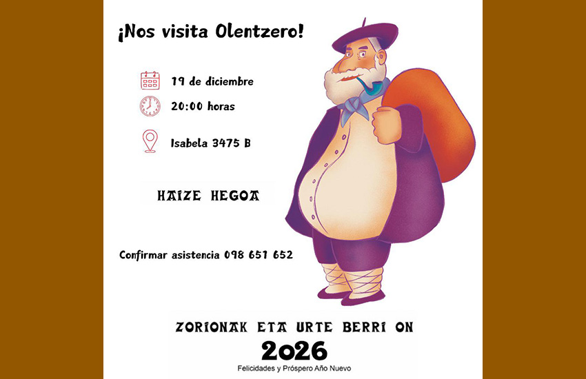 Abenduaren 19an, ostirala, 2026 urteari Azken Agurra emateko Festa eta Olentzeroren bisita Montevideoko Haize Hegoan, 20:00etan, euskal etxearen egoitzan (Isabela 3475 B).