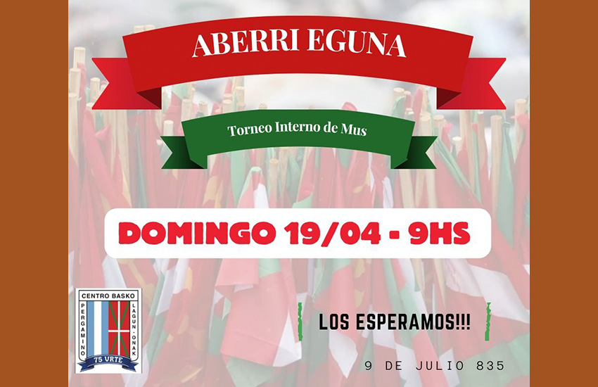Apirilaren 19an, igandea, 21etan, Aberri Eguna ospatzeko ekitaldia eta Mus Txapelketa Pergaminoko Lagun Onak Euskal Etxean.