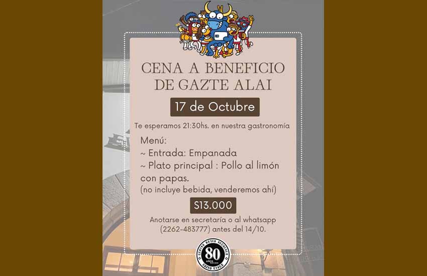 Urriaren 17an, ostirala, 21:30etan, Afaria Necocheako Euzko Etxean antolatua Gazte Alairen alde, Tandilgo Euskal Aste Nazionalera joan ahal izan ditezen.