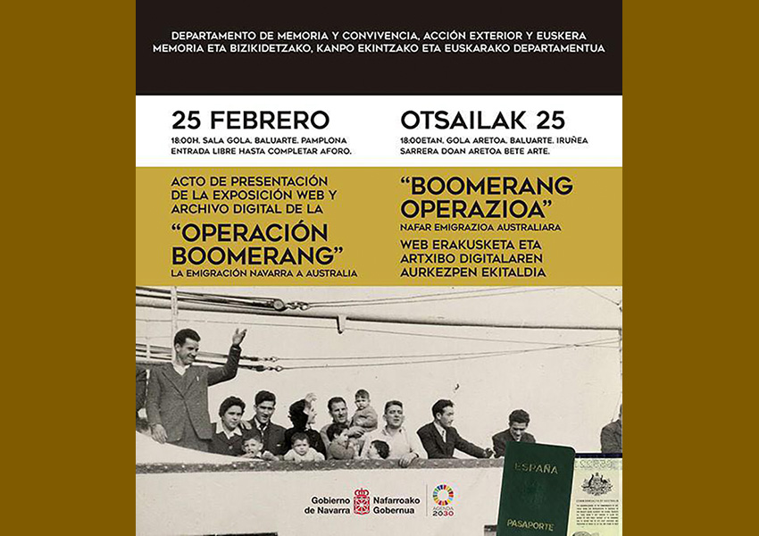 Otsailaren 25ean, asteazkena, 18:00etan, Australiako nafarrei buruzko "Boomerang Operazioa" web erakusketa web artxibo digitala inauguratuko dute. Gonbidapena luzatu dute Iruñeko Boomerang elkarte nafar australiarrak eta Nafarroako Gobernuak, Memoria eta Bizkidetzako, Kanpo Ekintzako eta Euskarako Departamentua egile.