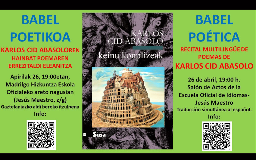 Astearte honetan, apirilaren 26a, Madrilgo Unibertsitate Konplutentseko Euskal Ikasketen Arloak eta Hizkuntza Eskola Ofizialak “Babel Poetikoa” antolatu dute. Karlos Cid Abasoloren poemak irakurriko dituzte Hizkuntza Eskolako ikasleek zenbait hizkuntzetan. Arratsaldeko 7etan, Hizkuntza Eskola Ofizialeko ekitaldi-aretoan (Jesús Maestro kalea, z/g).