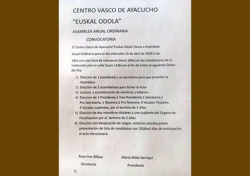 Apirilaren 15ean, asteazkena, bere Urteko Batzar Nagusirako deia egin du Ayacuchoko Euskal Odola Euskal Etxeak, 19:00etan bere egoitzan (Sucre 1146).