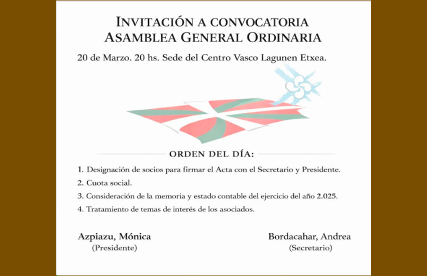 Martxoaren 20an, ostirala, Lapridako Lagunen Etxea Euskal Etxeak bere Urteroko Ohiko Batzar Nagusia egingo du, 20:00etatik aurrera, elkartearen egoitzan.