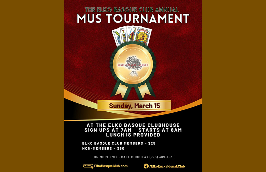 Bezperan Sheepherder's Ball dantzaldi eta festa famatua egin ondoren, martxoaren 15ean, igandea, Elkoko Euskal Etxeak bere Urteroko Mus Txapelketa jokatuko du EEaren egoitzan.