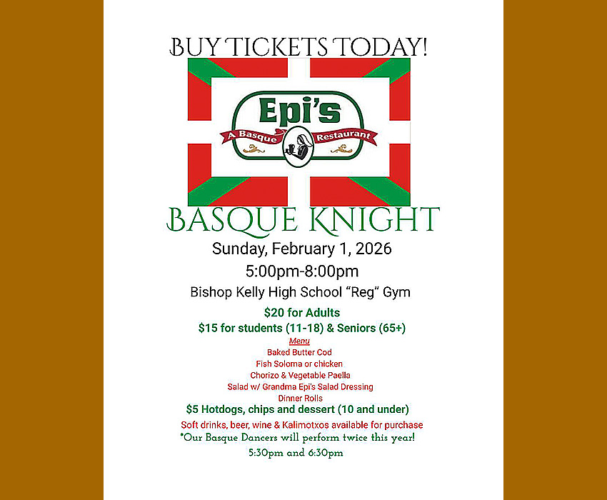 Otsailaren 1ean, igandea, 17etatik 20etara, Boiseko Bishop Kelly Institutuak antolatutako 'Basque Knight' gaua, euskal janaria Meridian-eko Epi's euskal jatetxearen kontu.