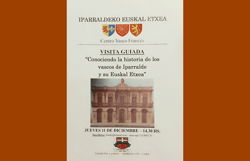 Elkartearen 130. urteurreneko urtea bukatzen ari den honetan, abenduaren 11an, 14:30an, bisita gidatua Iparraldeko Euskal Etxea-Centro Vasco Francés erakundera (Moreno 1370, CABA)